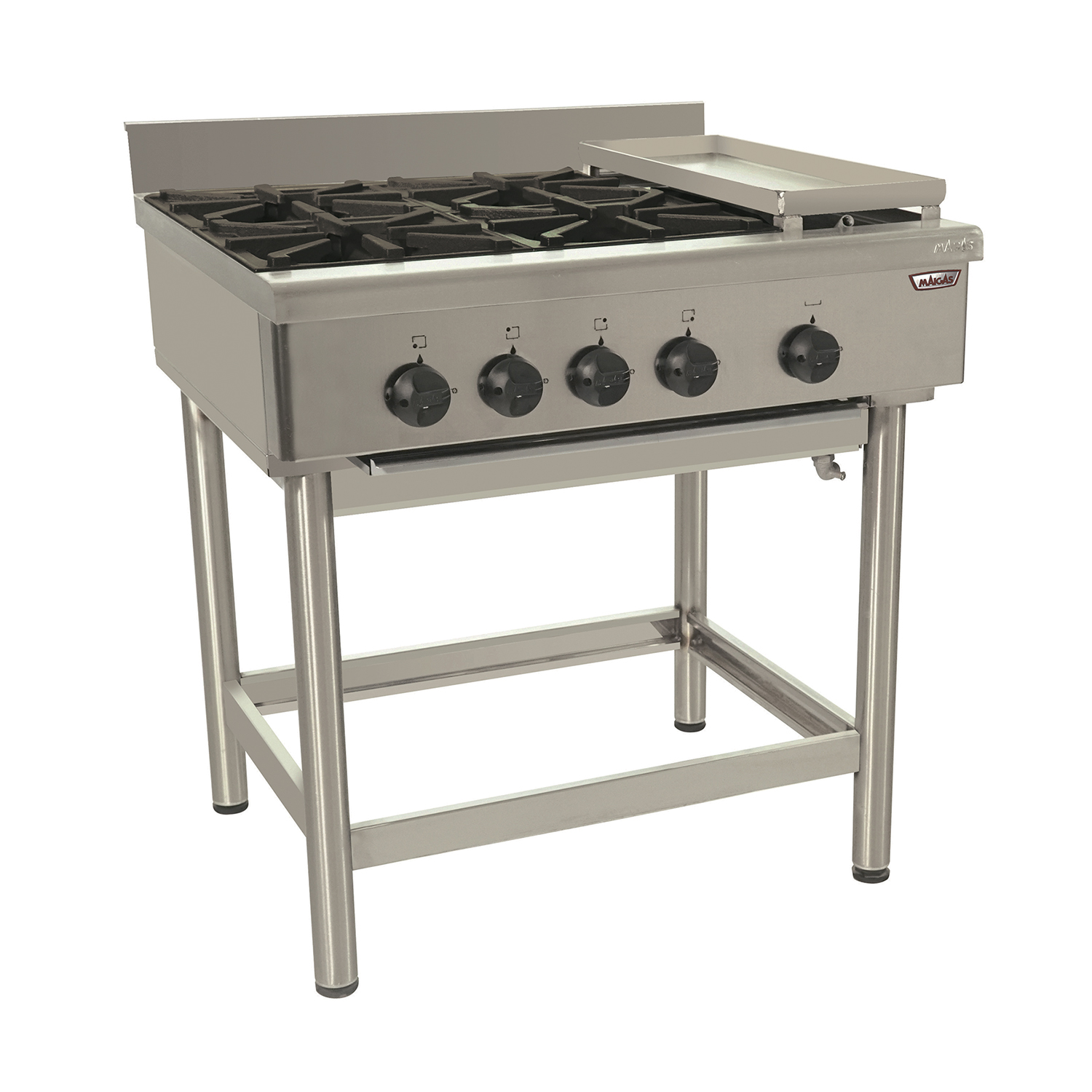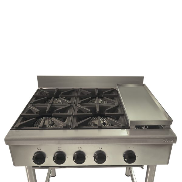 Construidos íntegramente en acero inoxidable. Platos de fierro fundido tratados con pintura resistente a altas temperaturas, diseñadas para sostener las ollas sin interrumpir la transmisión del calor. Quemadores industriales de aluminio de 140 mm de diámetro, comandados por llaves de 3 posiciones con dispositivo de seguridad. Plancha churrasquera de fierro fundido de 220 x 610 mm. Platos y bandeja de rebalse en acero inoxidable. Patas de acero inoxidable tubular. Estos equipos están certificados conforme a la reglamentación y normativa vigente.