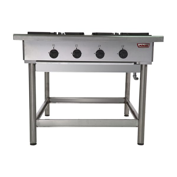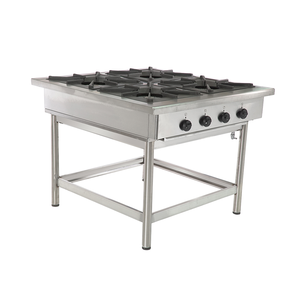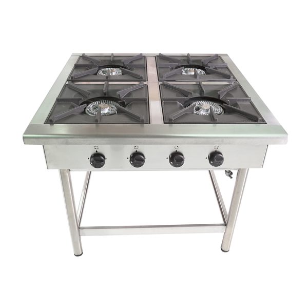 Construidos íntegramente en acero inoxidable. Platos de fierro fundido tratados con pintura resistente a altas temperaturas, diseñadas para sostener las ollas sin interrumpir la transmisión del calor. Quemadores industriales de aluminio de 180 mm de diámetro, comandados por llaves de 3 posiciones con dispositivo de seguridad. Platos y bandeja de rebalse en acero inoxidable. Patas de acero inoxidable tubular. Estos equipos están certificados conforme a la reglamentación y normativa vigente.